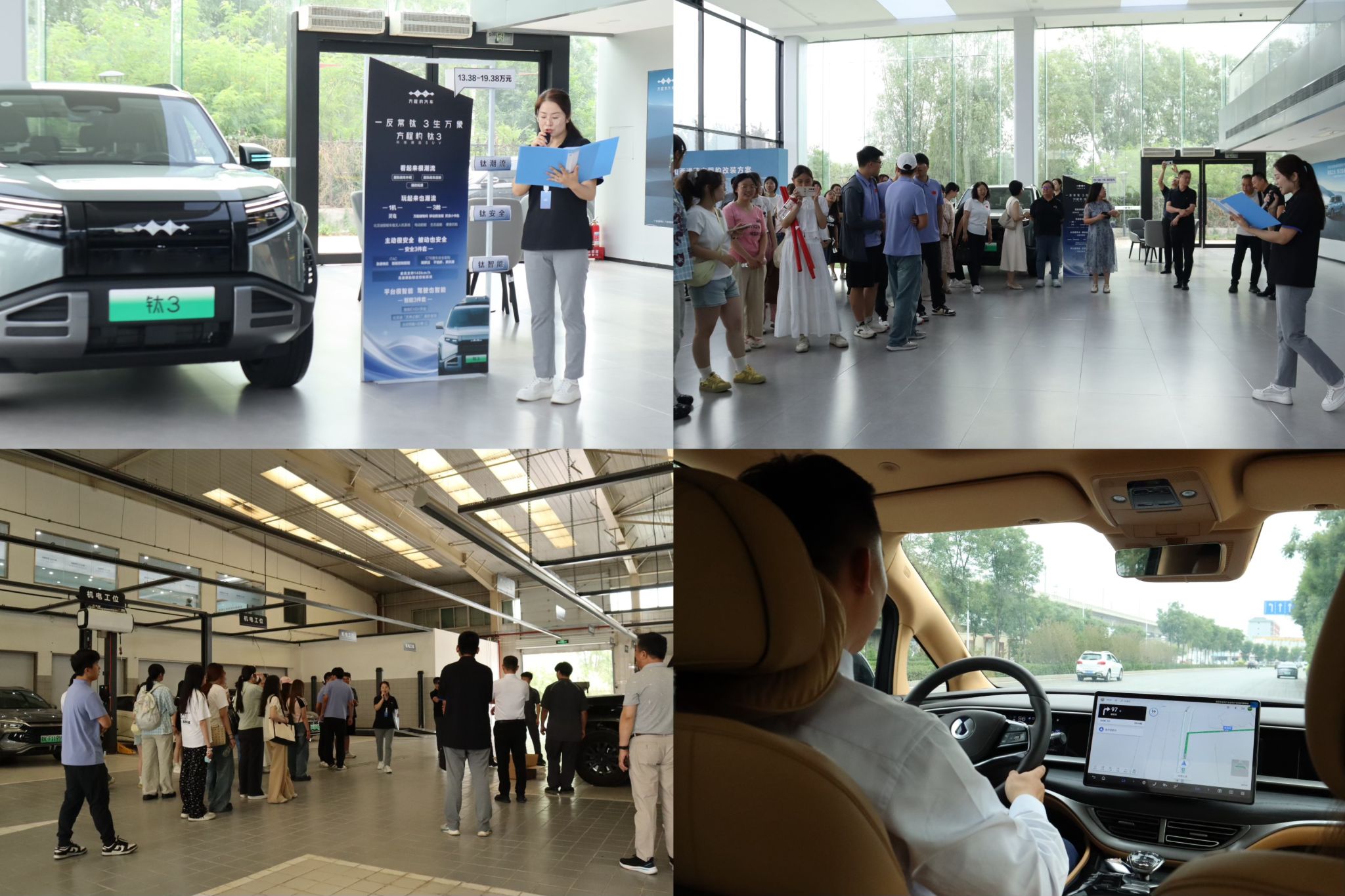 活动伊始,在晋中方程豹店工作人员引导下,参访师生实地参观了道蓝集团的新能源汽车展示区与售后服务场景,现场试乘了比亚迪旗下的方程豹、腾势等系列智能车型,沉浸式了解企业在汽车销售、金融保险、售后服务、二手车认证、动力电池回收等全生命周期服务运营模式和创新举措。通过主机厂品牌宣传片,师生们进一步了解比亚迪新能源汽车的发展战略与道蓝集团作为核心经销商的服务版图。