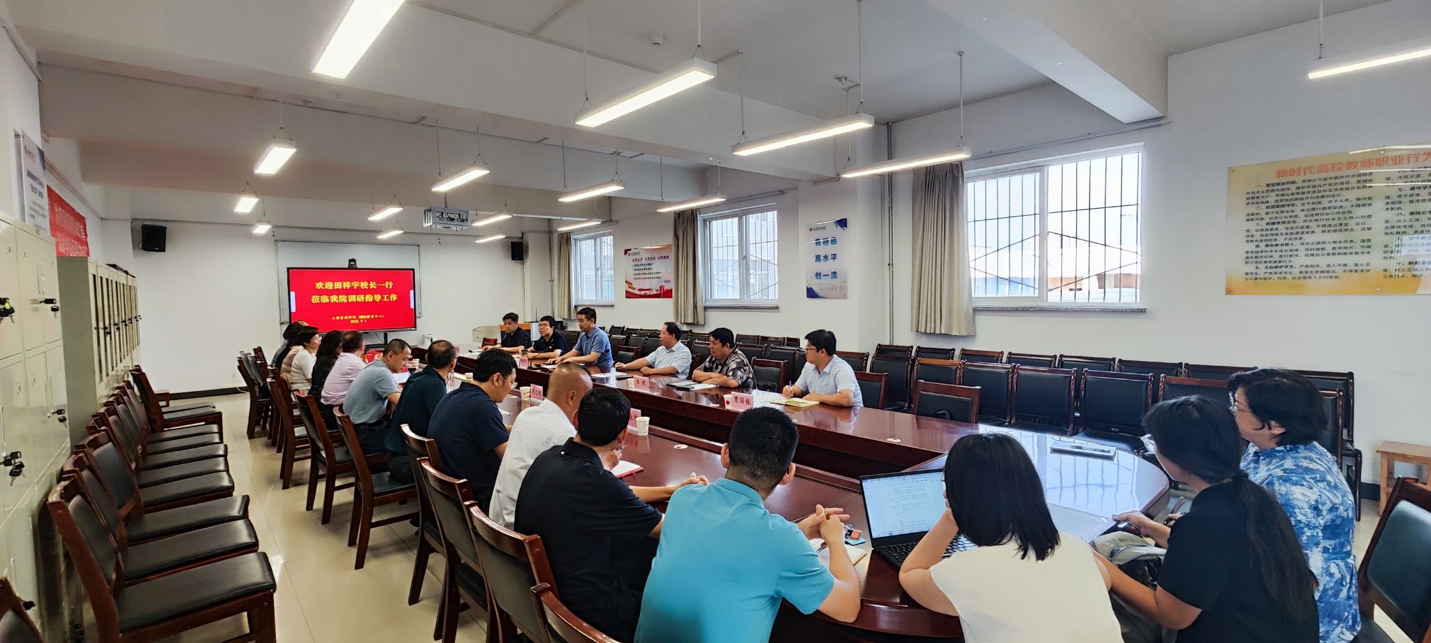 调研指导工作并召开座谈会。校党委副书记张永德、学校办公室、教务部、科研部、研究生院等部门负责人陪同调研。学院全体领导、教研室主任、各专业负责人、部分青年骨干教师等参加会议。会议由卫虎林院长主持。