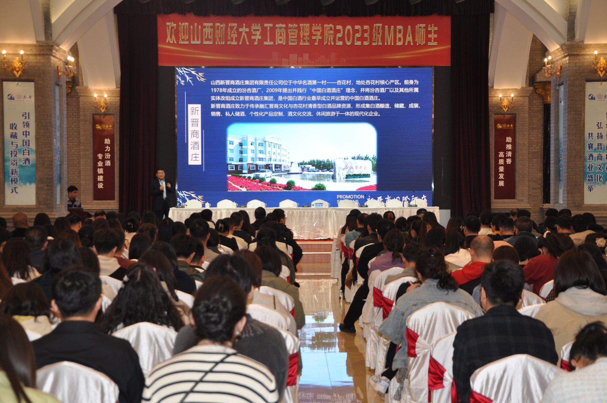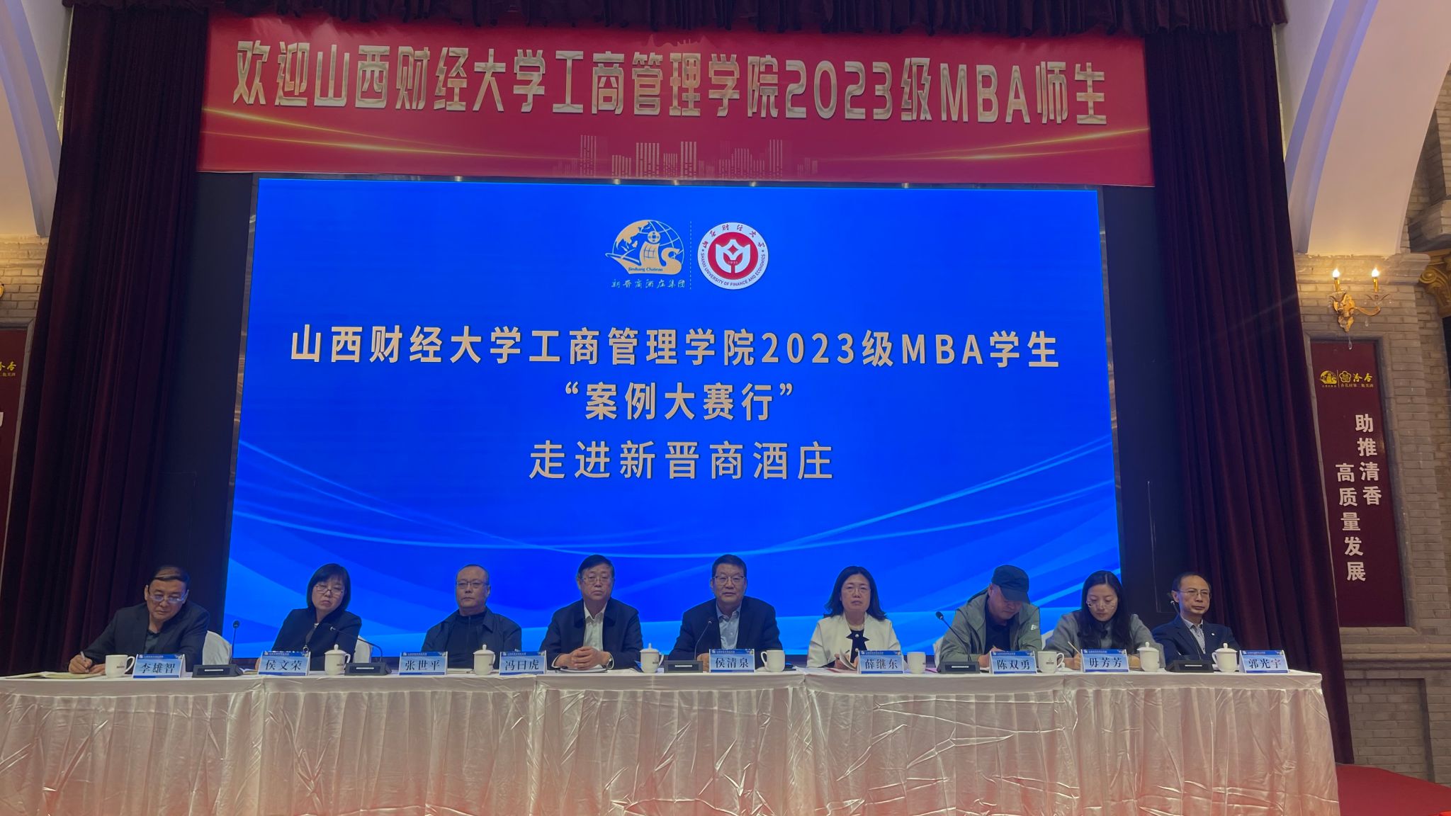 下午,在集团旗下的新晋商汾杏蔓兰酒店国宴厅,董事长侯清泉携公司部分高管亮相,为大家作了“山西新晋商酒庄集团打造中国白酒酒庄标杆与样板”的专题报告,从新晋商酒庄集团发展历史、文化积淀、品牌建设、技术研发、生产创新等方面,讲述了集团的过去、现在和未来。接下来的现场互动环节将本次活动氛围推向高潮,MBA学员针对案例大赛课题研究内容,聚焦新晋商酒庄集团,提出了企业战略、筹资活动、人力战略、运营管理管理等方面的具体问题,集团高管深入浅出、妙语连珠地对学员提出的问题一一予以解答,进一步加深了学员对集团管理的认知。