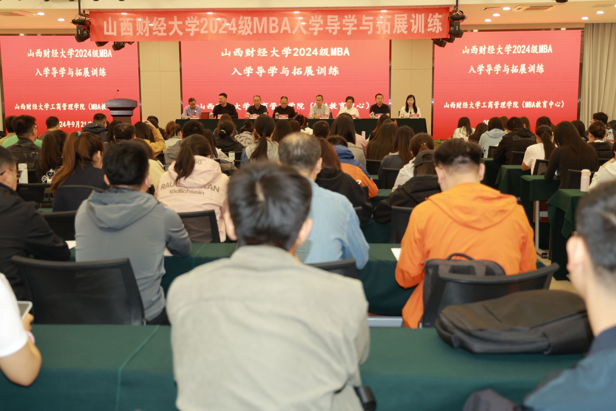 在阳曲县“营响未来•千曲国际教育营地”为2024级MBA新生举办了入学导学活动。学院领导班子成员、MBA教育中心全体工作人员、院工会主席、2024级MBA班主任、校友代表、MBA联合会代表以及2024级全体MBA新生等共240余人参加活动。会议由学院党委书记高岳主持。