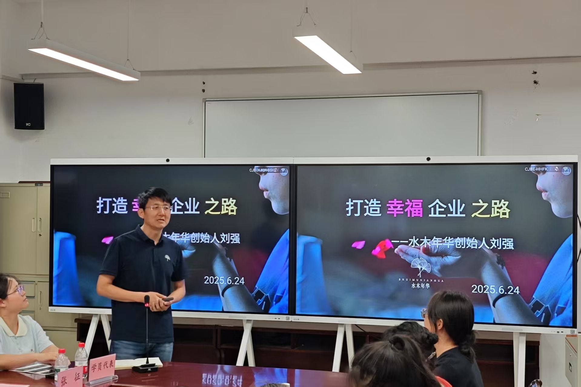 的美好祝愿。山西智胜传媒科技股份有限公司董事长郭海明以独特的文化视角,深入剖析“卓越”二字的内涵,指出了人生道路上选择的重要性,并鼓励同学们相信自己,热爱自己选择的道路。山西水木年华网络科技有限公司创始人刘强讲述了自己的职业经历和创业历程,分享了自己选择人力资源服务行业的原因和创办幸福企业的核心价值观,以亲身经历激励同学们找到适合自己的事业,并在长期坚持中发掘自己的潜力。山西体姆体育发展有限公司总经理马强分享了自己在马拉松和沙漠徒步赛事中挑战极限、突破自我的热血经历,强调了自律、坚持、挑战自我、团队精神的重要性,鼓励同学们不断超越自我,迈向卓越。