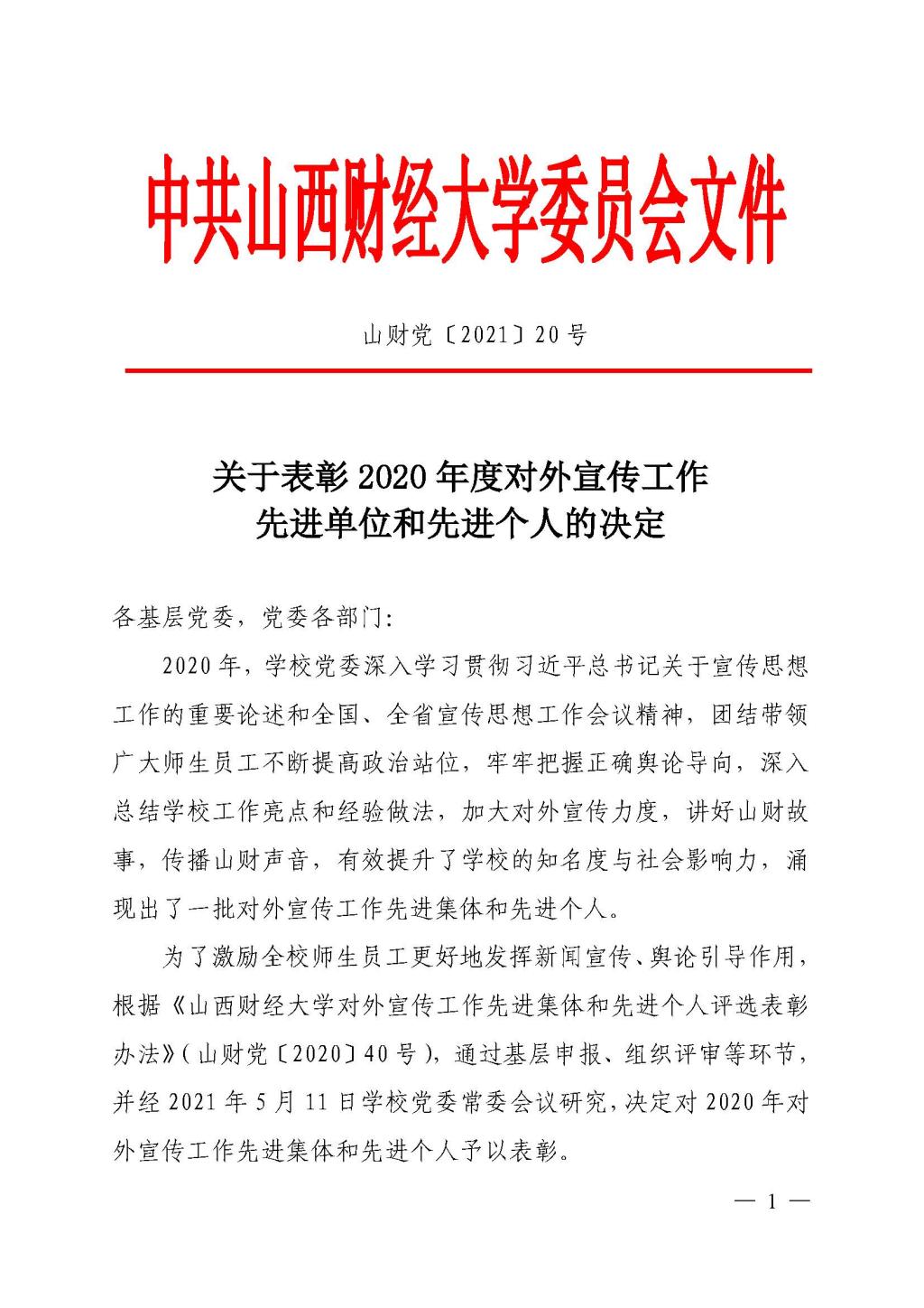 2020年度对外宣传工作先进单位”荣誉称号,受到学校党委表彰。