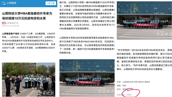MBA教指委校外专家为母校捐赠10万元抗疫物资和水果》为题进行了报道。截止4月22日13点,点击量已突破1万。