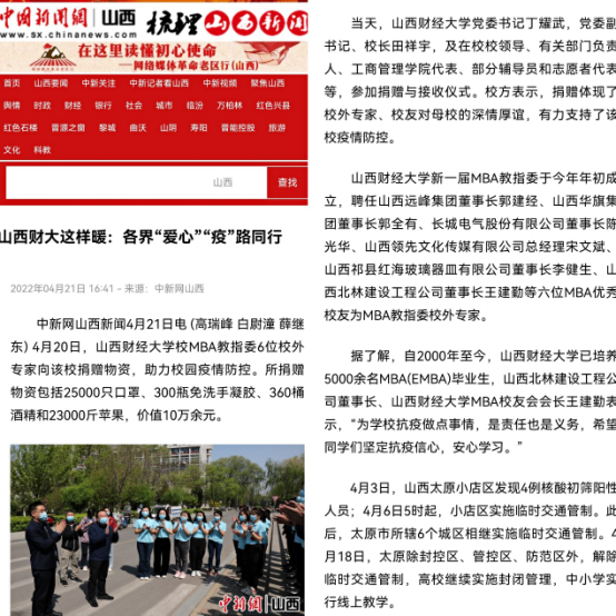 4月21日,中新网以《山西财大这样暖:各界“爱心” “疫”路同行》为题进行了报道。