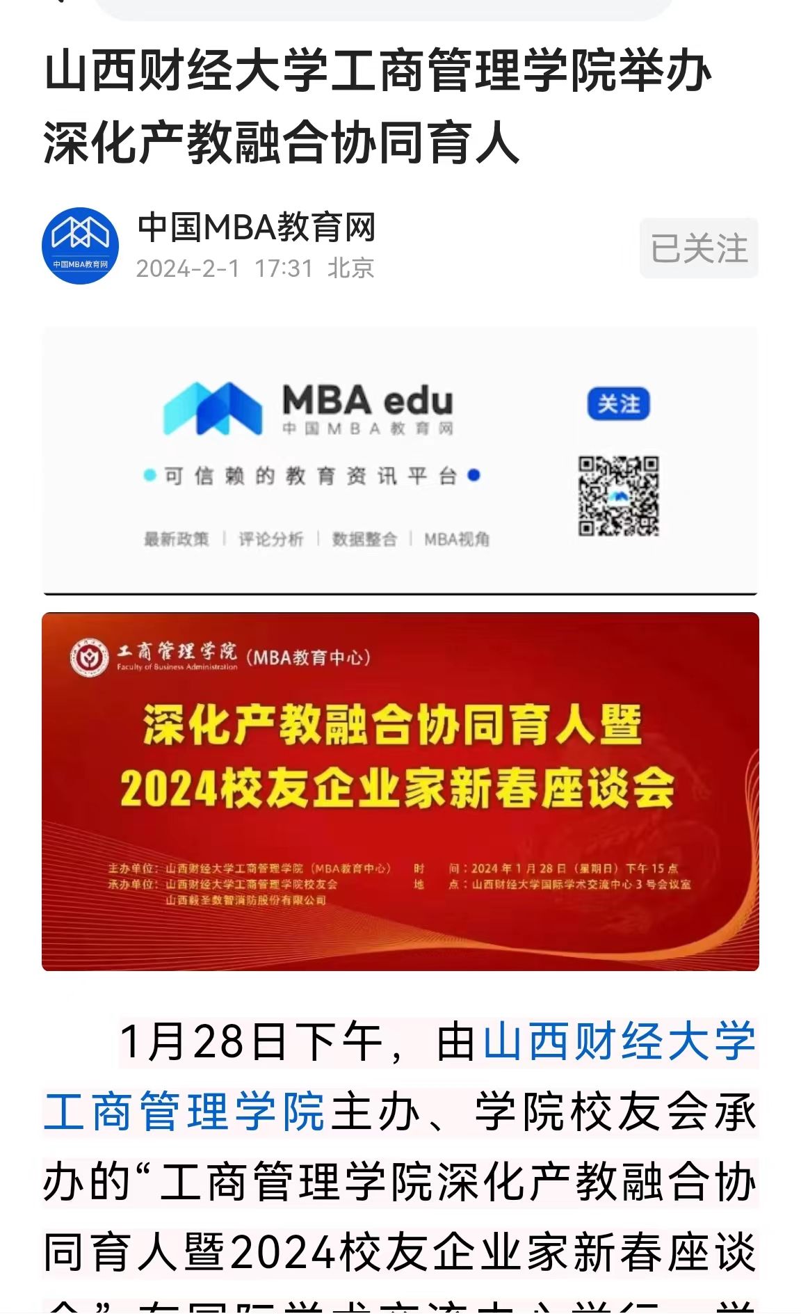 举办深化产教融合协同育人暨2024校友企业家新春座谈会