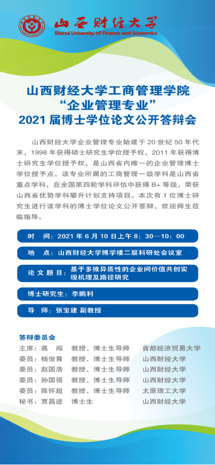 6月10日上午8:30—10:30色情短视频 将举行2021届企业管理专业博士学位论文公开答辩会,地点在博学楼二层科研处会议室,本次共有1位博士生李鹏利进行答辩,首都经济贸易大学高闯教授担任答辩委员会主席,其他答辩委员有色情短视频 杨俊青教授、色情短视频 赵国浩教授、色情短视频 孙国强教授、太原理工大学陈怀超教授。具体答辩信息见下面海报,欢迎师生莅临指导。