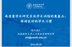 关于努力强化系统学术训练,杨付教授从文献“三部曲”、撰写“双导航”、规划“三循环”三部分出发,对学术研究中的文献分析、论文写作以及目标管理三方面的学术训练展开分享。首先,就文献分析而言,杨教授提出在文献阅读与整理中要奏好“纸质标记”、“整理标记”和“文献积累”的“三部曲”,在文献引用与分析中要重视可视化分析和内容分析。其次,就论文写作而言,杨教授通过分享课题组成员的实例,从高质量选题、数据收集以及论文修改和完善等方面,来说明如何做好文献综述论文和实证论文的设计与撰写训练,并提出可通过分解注释法和标签借鉴法“双导航”来实现“初稿就是定稿”。最后,就目标管理而言,杨教授提出要形成“月度规划”、“周度自检”和“隔天反馈”的“三循环”。