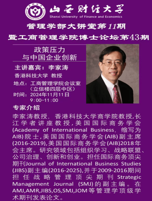 专家简介:李家涛教授现任香港科技大学(科大)商学院利国伟商学讲席教授,管理学系讲座教授、科大商学院商业战略与创新研究中心主任, 科大高等研究院 (IAS)资深学人,长江学者讲座教授,美国国际商务学会(Academy of International Business,缩写为AIB)院士,美国国际商务学会(AIB)副主席(2016-2019),美国国际商务学会(AIB)2018年会主席。李家涛教授是国际商业战略的资深专家,致力于推进新兴国家的企业战略研究。他目前担任国际商务顶尖期刊Journal of International Business Studies (JIBS)副主编(2016-2025),并于2009-2016期间担任战略管理顶尖期刊Strategic Management Journal (SMJ)的副主编。李家涛教授的研究领域包括组织学习、战略联盟、公司治理、创新和创业。他的研究成果经常发表在Academy of Management Journal, Academy of Management Review, Journal of International Business Studies, Organization Science, Strategic Management Journal,和Journal of Management等管理学顶级学术期刊,更有不少获得最佳论文奖项。他目前还担任Academy of Management Journal, Strategic Management Journal,Journal of Management, Global Strategy Journal, 和Journal of International Business Policy等国际顶级管理学期刊编委会委员。