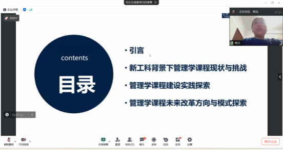 会上,常洁老师首先围绕新工科建设的背景与意义,介绍了新工科视域下管理学的发展重点及课程建设目标与定位。其次,剖析了现阶段管理学课程存在的教学模式单一、理论与实践脱节、评价体系不合理、学生兴趣不高等问题,并指出新工科为管理学课程改革带来了跨学科融合、实践性教学、创新能力培养、国际化视野等新要求。在此基础上,常洁老师结合太原科技大学的具体实践,详细分享了包含专业设置、教学目标、师资队伍、教学方法与手段改革、实践与创新能力培养、课程内容与体系创新、课程评价与改进等多个方面的管理学课程建设实践探索成果。最后,围绕管理学课程的未来改革方向提出了校企合作、企业参与课程建设与评价、辐射带动的路径与措施、优秀案例分享与借鉴等多种可行模式,为参会老师们提供了宝贵的经验借鉴与启示。