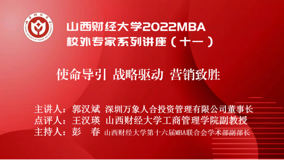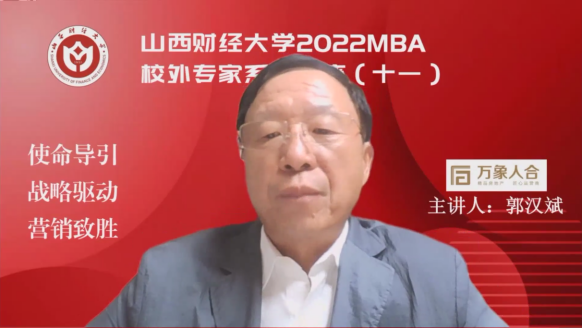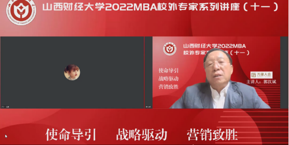 2022MBA校外专家系列讲座第十一期在“腾讯会议”平台圆满举办。深圳万象人合投资管理有限公司创始人郭汉斌先生带来了题为《使命导引 战略驱动 营销致胜》的专题讲座,2020级、2021级MBA学员、2022级拟入学MBA学员、部分MBA教师、MBA校友等近300人参加,本期讲座还得到MBAChina网站的同步转播。