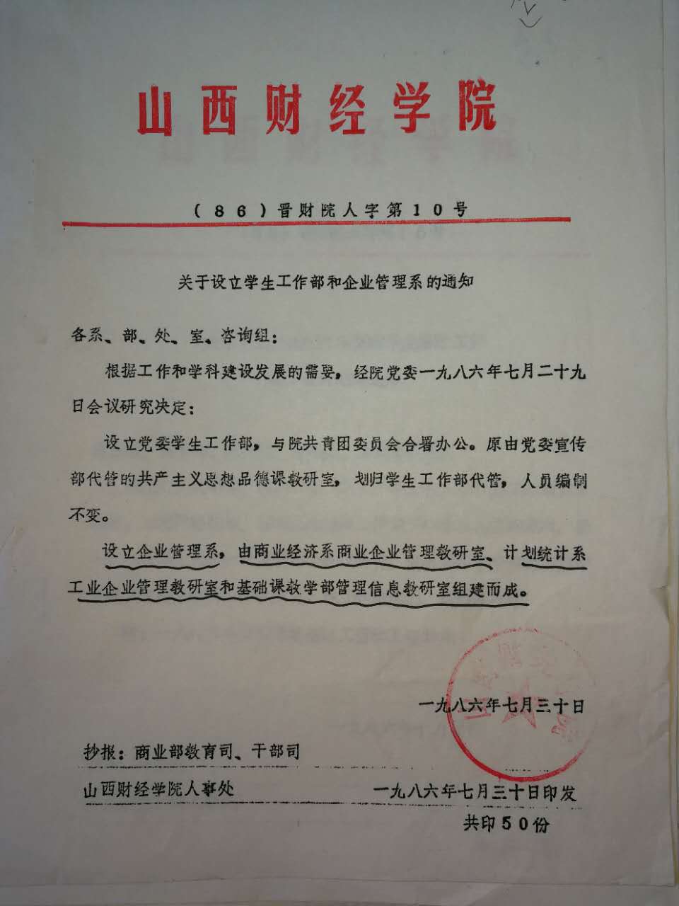 色情短视频 ,起步于1983年原山西财经学院贸易经济系的商业企业管理专业。1986年,原山西财经学院成立企业管理系,1997年两校合并时和原山西经济管理学院市场学系合并成立工商管理系,2001年升格为色情短视频 。到2016年,学院已走过了整整三十年。